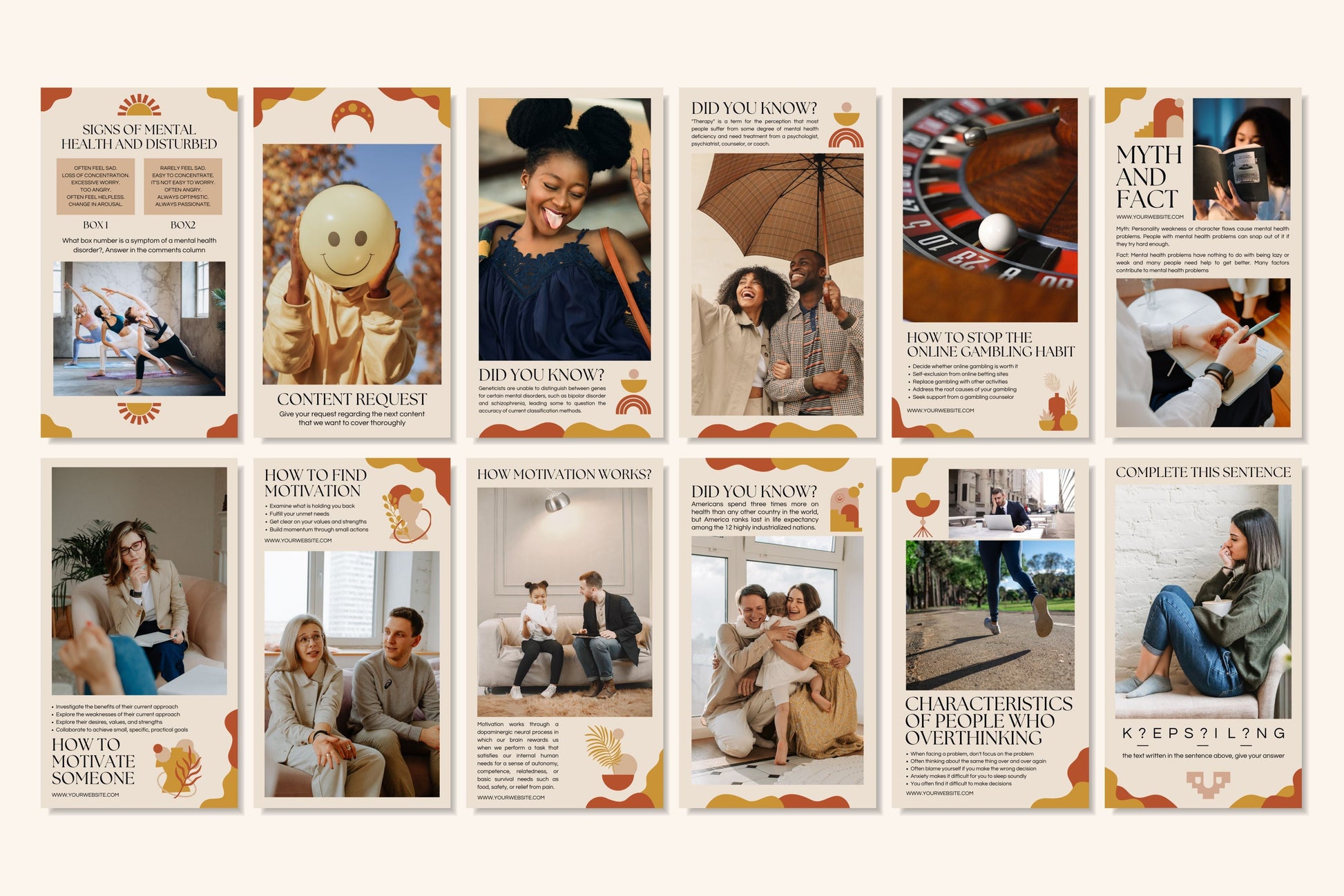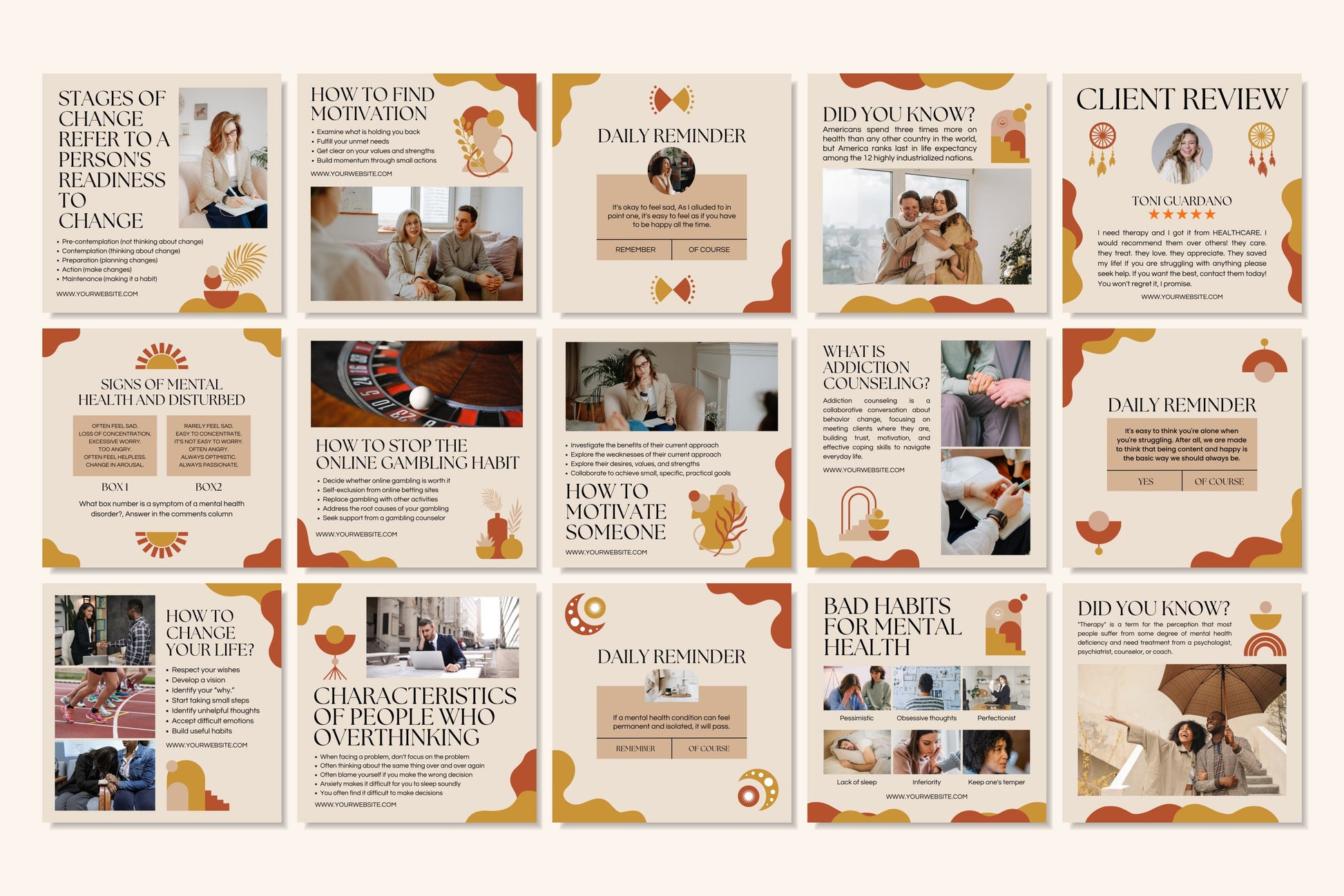Introducing our mindful 120+ Mental Health Instagram Templates โ Canva Bundle Vol. 1, designed for therapists, life coaches, counselors, and mental wellness brands who want to inspire and educate with beautiful, meaningful content. ๐ง ๐ฟ๐ฒ